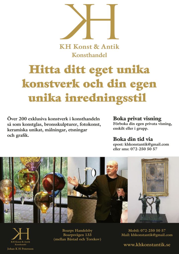 Mycket nyinkommet, lokala konstnärer samt Inge Schjöler, GAN, akvarell, Anders Zorn 1882 samt keramikskulpturer i olika prisnivåer.