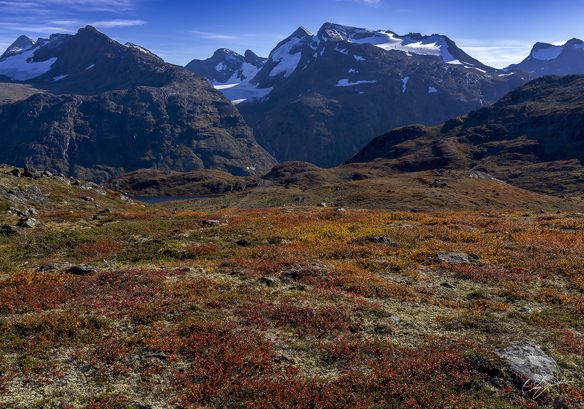 Det här är det mest vidsträckta högalpina fjällområdet i Norge vilket lockat mig till flera vandringar. Den här gången följde vi norra sidan av den fjord liknande sjön Gjende och kunde beundra fjällmassiven söder om sjön som höjde sig i kristallklar luft. De höst färgade risen på marken där vi gick gav en kulört motpol till de mörka fjällsidorna längre bort.